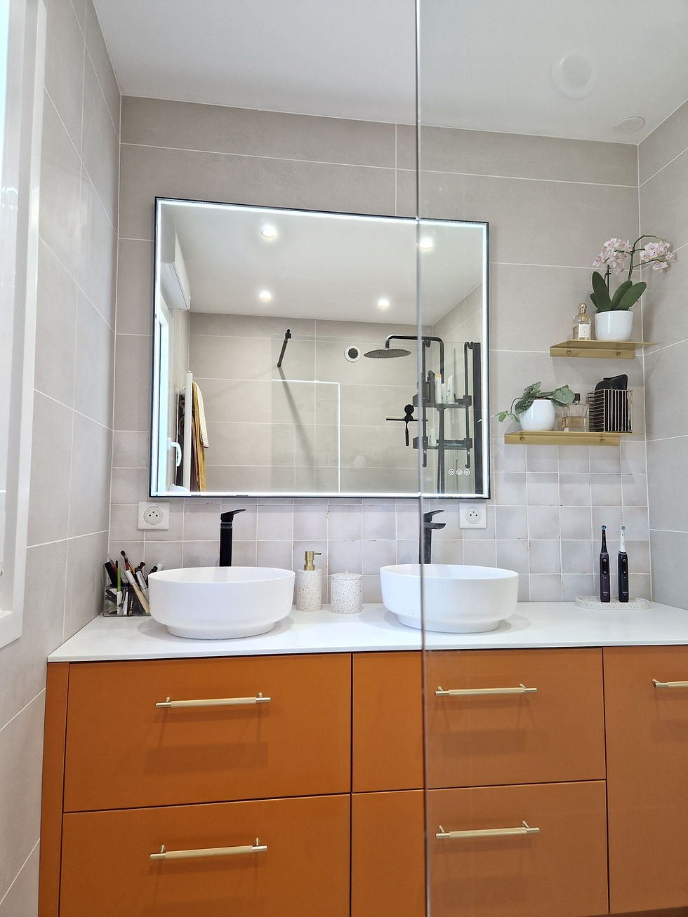 Pour ce petit espace de 4m², j'ai mis l'accent sur le mix de matériaux: des grands rectangles 30X100cm beige, pour agrandir visuellement l'espace, des petits carreaux style Zellige en crédence, et un sol effet terrazzo coloré.